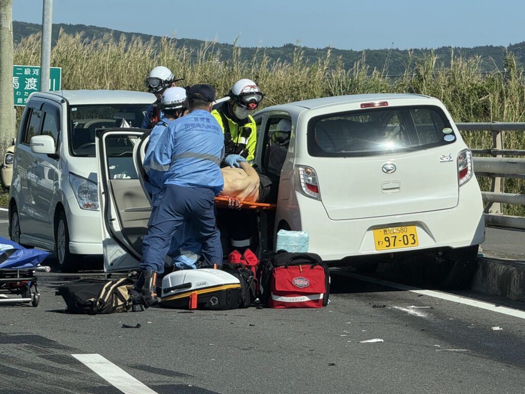 上半身裸の高齢者男性を車から、救出して、救急車へ。